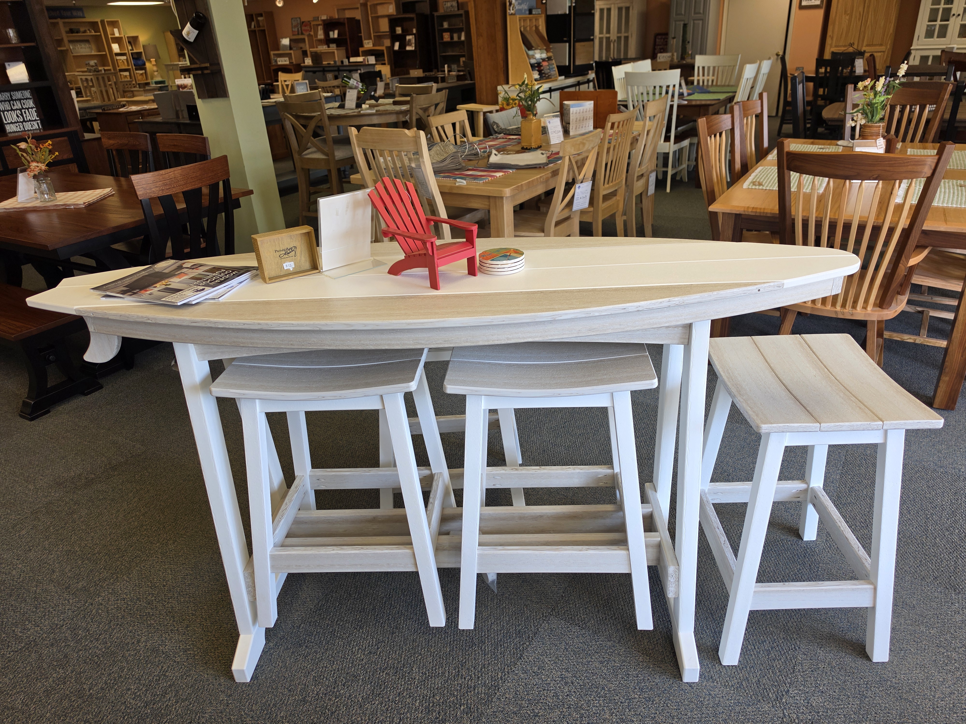 White & Seashell Surfboard Table & 4 Stools, Was $2069, Sale $1965