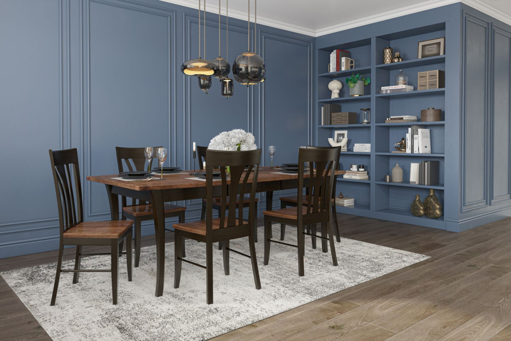 All legs, aprons and chair frames are standard in Brown Maple. Table tops and chair seats are available in Red Oak, Brown Maple, Wormy Maple, Sap Cherry, Premium Cherry and Elm. Standard widths of 42" & 48", choice of solid top or available with 2 or 4 leaves.