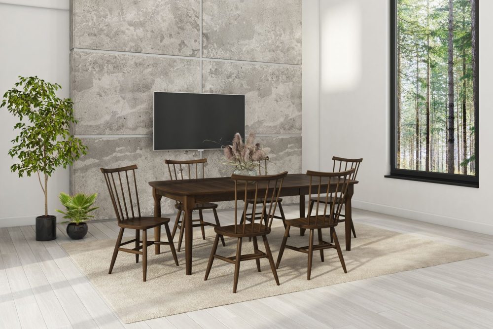 All legs, aprons and chair frames are standard in Brown Maple. Table tops and chair seats are available in Red Oak, Brown Maple, Wormy Maple, Sap Cherry, Premium Cherry and Elm. Standard widths of 42" & 48", choice of solid top or available with 2 or 4 leaves.