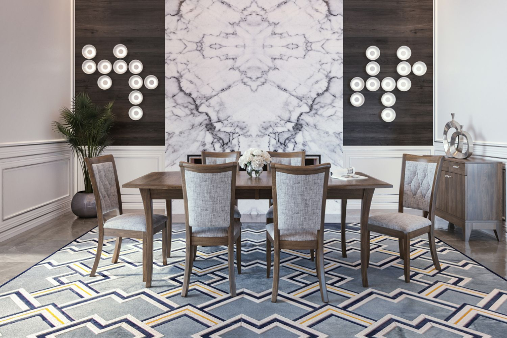 All legs, aprons and chair frames are standard in Brown Maple. Table tops and chair seats are available in Red Oak, Brown Maple, Wormy Maple, Sap Cherry, Premium Cherry and Elm. Standard widths of 42" & 48", choice of solid top or available with 2 or 4 leaves.
