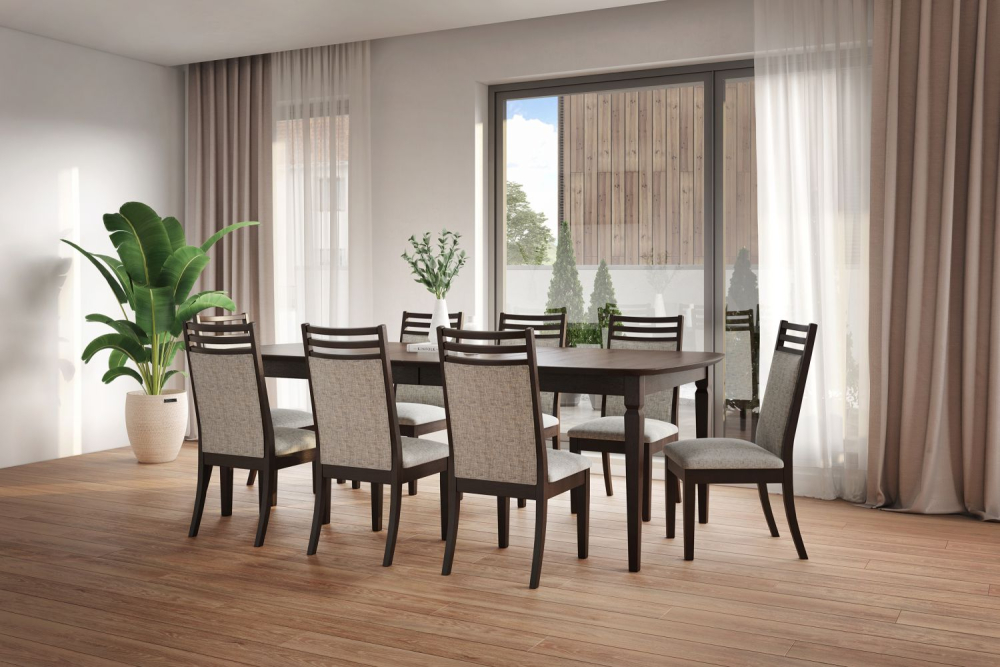 All legs, aprons and chair frames are standard in Brown Maple. Table tops and chair seats are available in Red Oak, Brown Maple, Wormy Maple, Sap Cherry, Premium Cherry and Elm. Standard widths of 42" & 48", choice of solid top or available with 2 or 4 leaves.