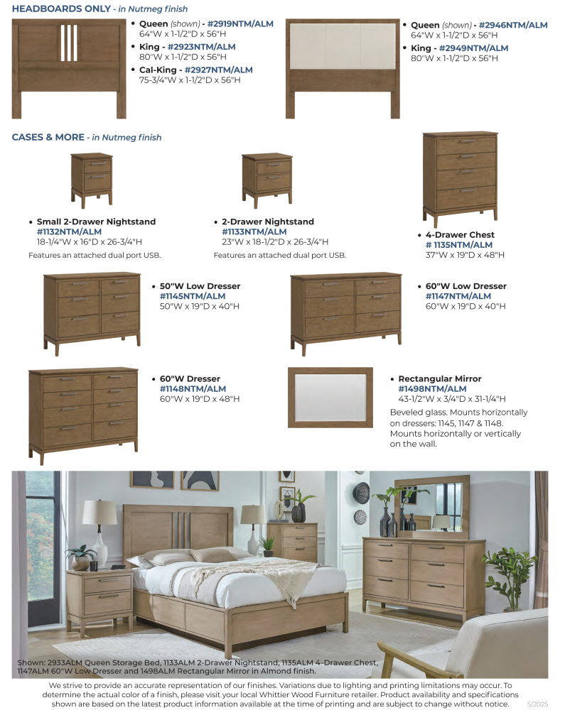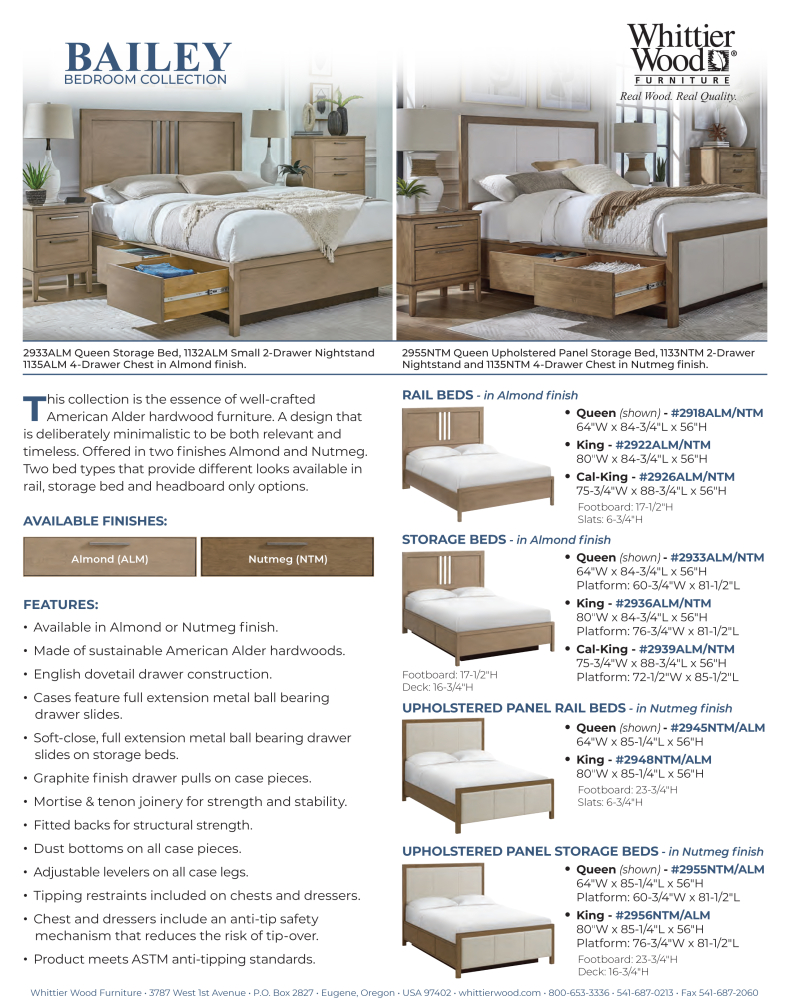 Bailey Bedroom Collection has a deliberate, minimalistic design that is both relevant and timeless. It is the essence of well-crafted, real wood furniture for today’s modern living. Two different earth-tone finish options combine with elongated drawer pulls in a graphite finish adding a touch of elegance to the design. The Nutmeg finish is reminiscent of the exotic spice, warm in tone. The Almond finish is a creamy beige, light and neutral. Created from American Alder hardwoods. English dovetail, solid wood drawer construction and full extension metal ball bearing drawer slides ensures longevity. Nightstands feature dual port USB. Two bed styles and two bed types offer different looks. One bed is solid wood with a slat detail and the other is an upholstered headboard and footboard combination. Both bed designs come in storage, rail and headboard only options. Headboard only option is compatible with most Hollywood bed frames.
