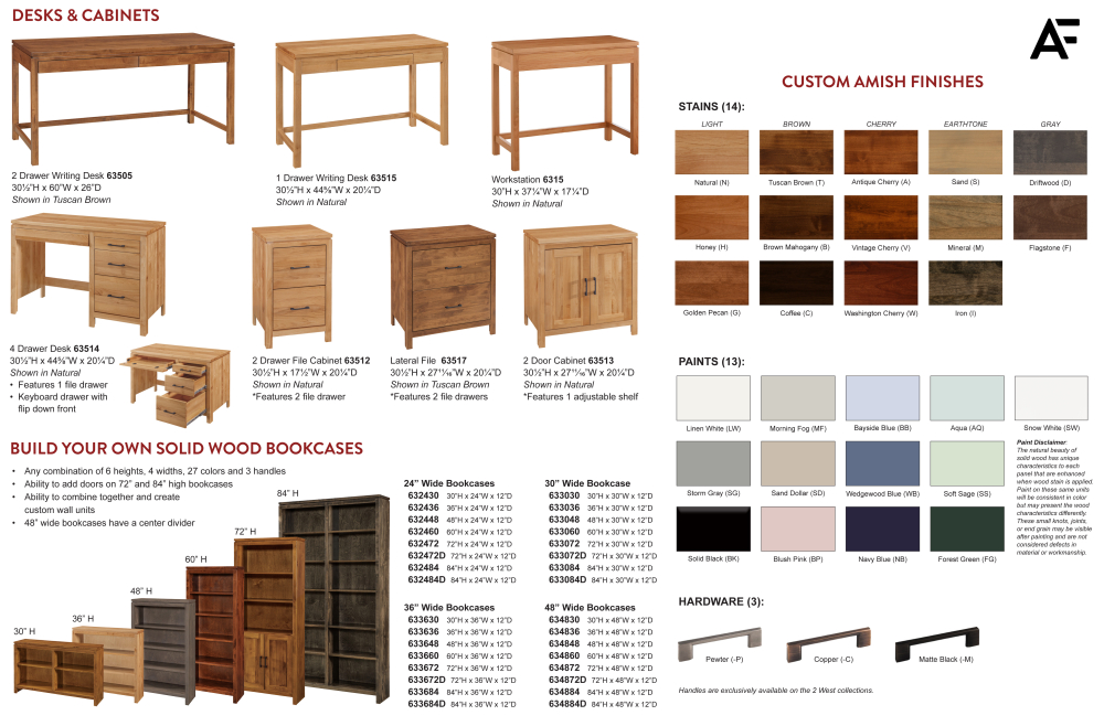 Part of the 2 West Office Collection. Available factory finished. Shown factory finished in Honey. This collection features solid North American alder, English dovetail drawers, and 100 lb. rated full extension drawer glides. Personalize your Office with your choice of 7 hardware options and 27 custom Amish color options. Each piece of furniture is hand finished by our Amish partners and protected with a high quality catalyzed finish to provide worry-free furniture for years to come. Contact store for details.